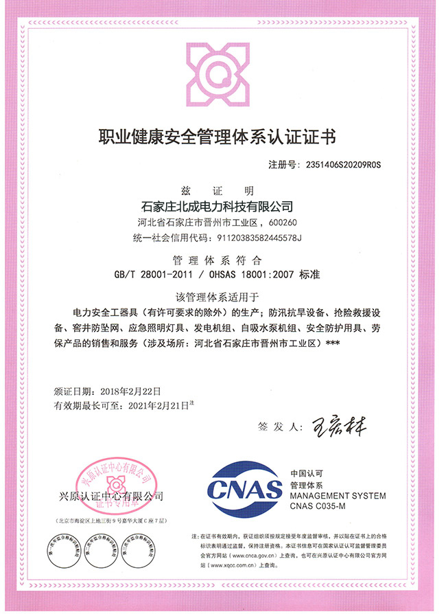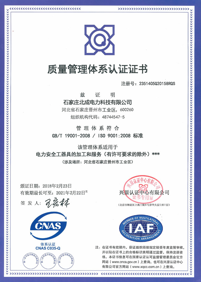 石家莊北成電力科技有限公司坐落于晉州市電力開發區,憑借雄厚的技術力量,齊全的檢測手段,品質的安全保證;通過國家檢測認證等,在生產和檢測環節嚴格執行國家統一質量標準,并制定了一整套完善的質量管理和監督體系,公司產品均經過安全工器具質量監督檢驗,頒發了產品檢測報告。連續多年被合作客戶稱為文明誠信、質量守信單位!